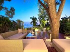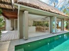 The living area is in the second pavilion, to the right of the pool. This too has a verandah at its ocean side, and the glass doors all around the living area and kitchen can be thrown back to bring the indoors and outdoors together to create the perfect entertainment and socialising space. The living room has a high double vaulted ceiling, and includes comfortable sofa seating and a dining table for six guests. The designer kitchen is fully equipped, and features a white island unit serving as both a breakfast bar and housing for the integrated appliances, the hob and sink. At the back of the kitchen are a covered courtyard garden and the stairs leading to the mezzanine TV room. This room has comfortable seating and the satellite TV/DVD system. There are also curtains for closing this area off from the living room below.