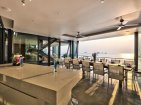 The entrance to this 3-storey villa is via the 4-vehicle parking courtyard, where a gateway leads to a bridge and into the formal living room on the first of the three levels of this property. The front of the property on all levels is glass walled, facing the ocean, and a central floating glass stairway, illuminated at night as a spectacular feature, connects the floors. The huge open plan living room to one side of the stairwell overlooks a pretty Koi fish pond and waterfall at the back, and there is a huge balcony to the front beyond the glass doors with sea view. It is furnished with large sofas facing the ocean and a cinema screen controlled by the entertainment system, which can also pipe music from its vast library throughout the property. The other side of the glass staircase is the dining room, where an enormous table can accommodate up to 20 guests. The fully equipped western style kitchen is to the rear of the dining room.