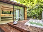 On the top floor there are two master bedroom suites. As well as features that all the adult suites enjoy, each has a spacious dressing room which could take a baby cot, and the en suite bathrooms have walk-in rain showers, an outdoor bathroom with either a double bath tub or a private garden shower. And one of the suites also has an open shower in the bedroom. The other two bedroom suites are in separate pavilions at pool level. Each has an indoor bathroom with bathtub and a shower and a teak wood terrace surrounding the pavilion. All four suites have king size beds, desks, wardrobes and glass walls opening onto the terraces.